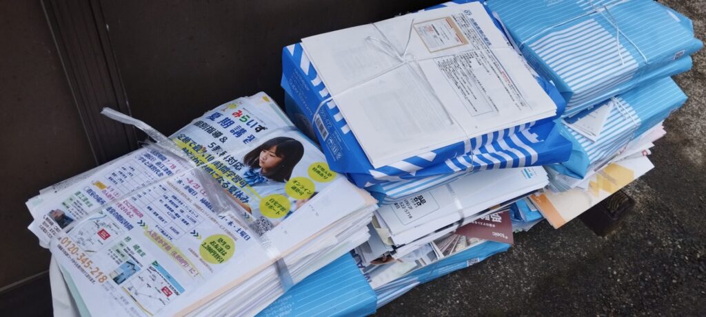 教室では使ったプリント類を古紙回収に出しています。回収された古紙は地元の小学校のPTAの活動費になります。