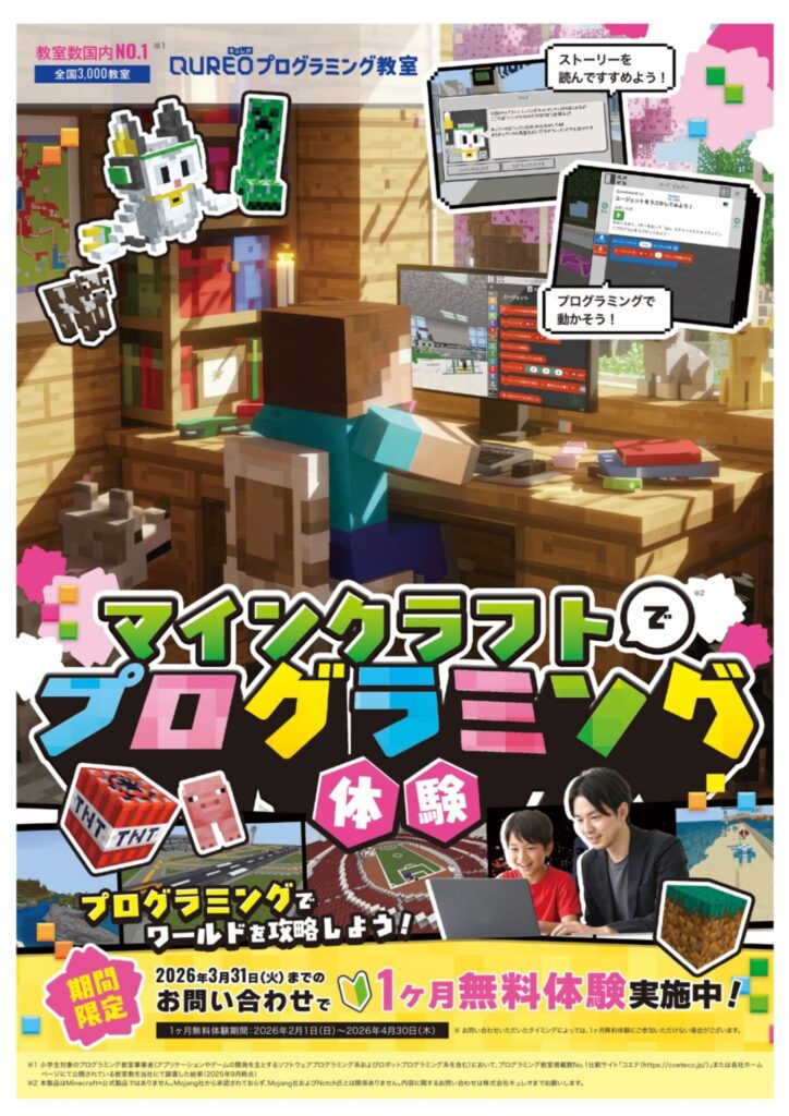 マイクラから始め、1年間で受講者全員がプログラミング検定に合格しているプログラミング教室も1か月無料です。